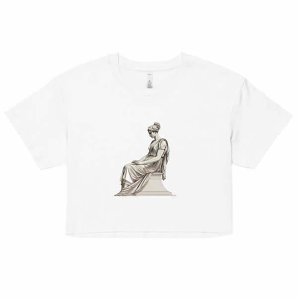 Her flowing draped garb and serene pose evoke the ethos of ancient times. This crop top is made of 100% combed cotton, which makes the shirt extremely soft and more durable than regular cotton shirts. The relaxed fit and dropped shoulders ensure comfortable wear, while the cropped length makes it perfect for spring and summer.